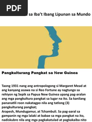 Study on the go. Ang gawaing ito ay naglalayong mapaghambing mo ang tatlong pangkulturang pangkat sa New Guinea ayon sa pag-aaral na isinagawa ni Margaret Mead at ng bansang Pilipinas. Independent State of Papua New Guinea ay isang bansa sa Oceania sinasakop ang silangang kalahati ng pulo ng Bagong Guinea at ilang mga panlabas na pulo ang mga lalawigan ng Indonesia ng Papua at Kanlurang Irian Jaya Irian Jaya Barat ang sumasakop ng natitirang.
